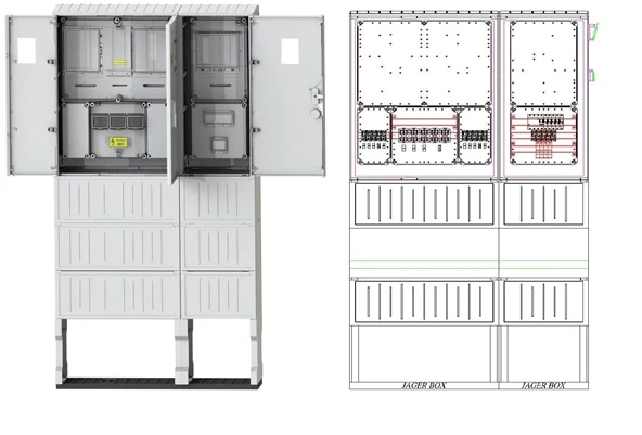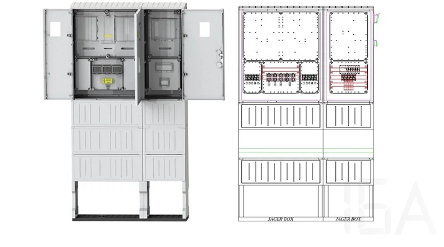 Egy felhasználási helyes M63.80A, V32A és H63.80A mérés, földkábeles, szabadon álló kivitelben, fogyasztói főelosztóval, túlfeszültség levezetővel