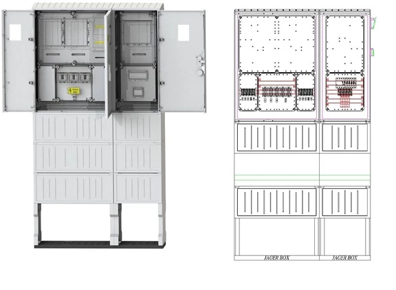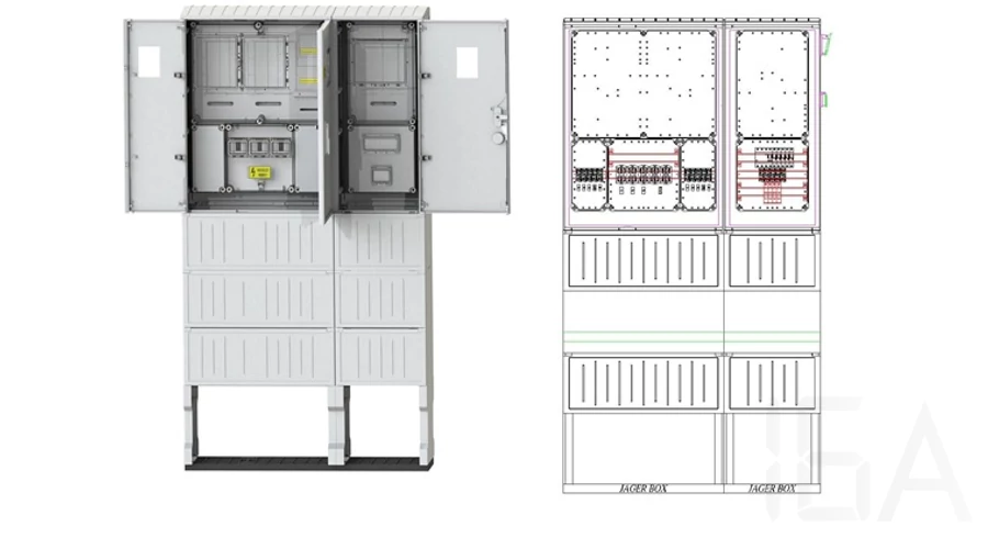 Egy felhasználási helyes M63.80A, V32A és Hv32A mérés, földkábeles, szabadon álló kivitelben, fogyasztói főelosztóval, túlfeszültség levezetővel