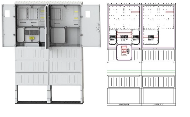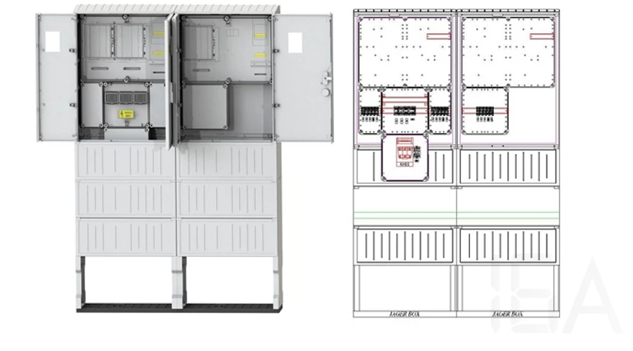 Egy felhasználási helyes M63.80A, V63.80A és Hv63.80A mérés, földkábeles, szabadon álló kivitelben, fogyasztói főelosztóval, NH00 szakaszoló biztosítóval a méretlen oldalon