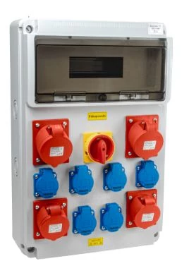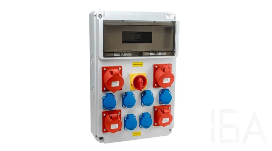TP ipari doboz szerelt, vezetékezett, kismegszakítóval és Fí-relével, 4X(2P+F)+1x(5P16A)+1x(5P32A) dugalj, IP44, 3320-004-5700KF