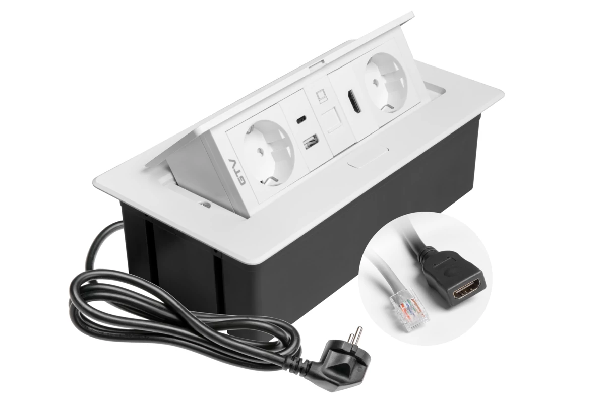 GTV pultba süllyeszthető konnektor, 1db 230V-os dugalj 1db USB-A és 1db USB-C aljzat, rejtett gombbal kinyitható, 1.5m kábellel, műanyag, fekete-fehér szín, AE-PB1SAVA-10N Áraink darabárak, a termék kiszereléseire vonatkoznak! A termék kiszerelése 1 darab.